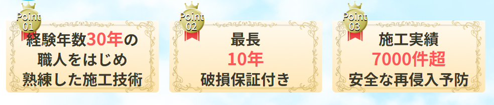 - 駆除後のフォローも充実しており、最長5年の再発保証に加え施工1年後の無料点検も付く